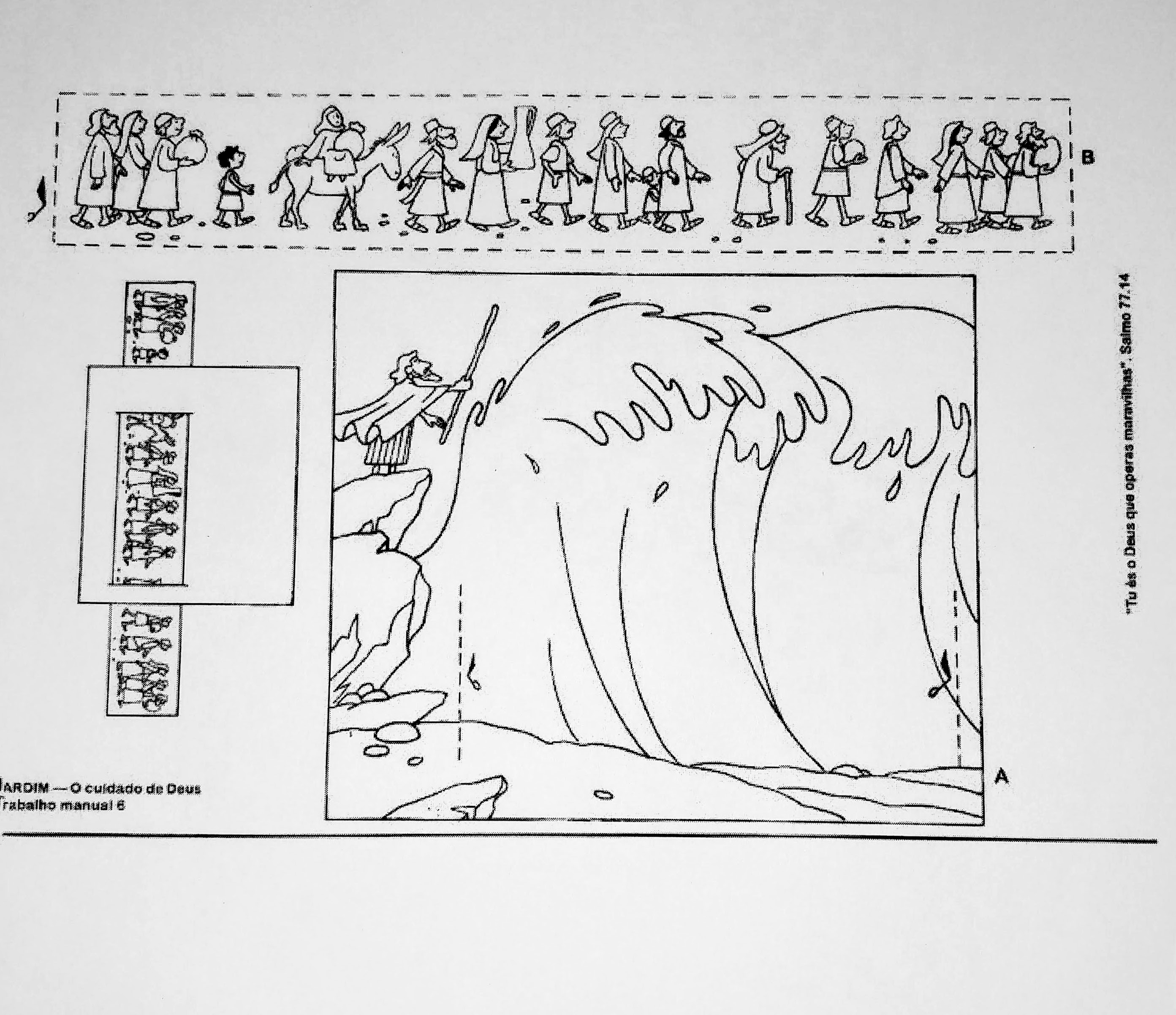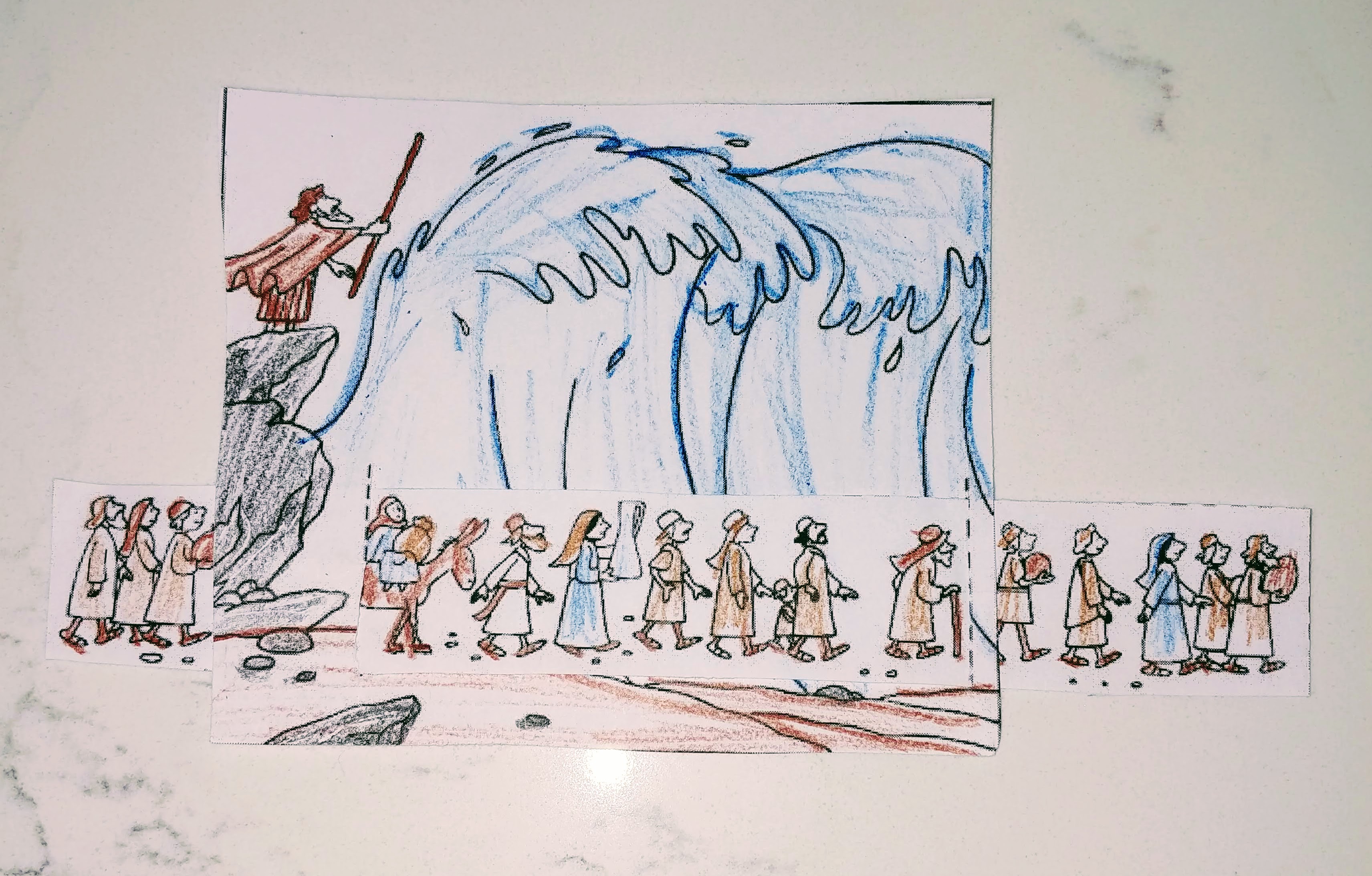 - Cut 2 slits on the lines in the Red Sea picture and weave the people strip through the slits.
