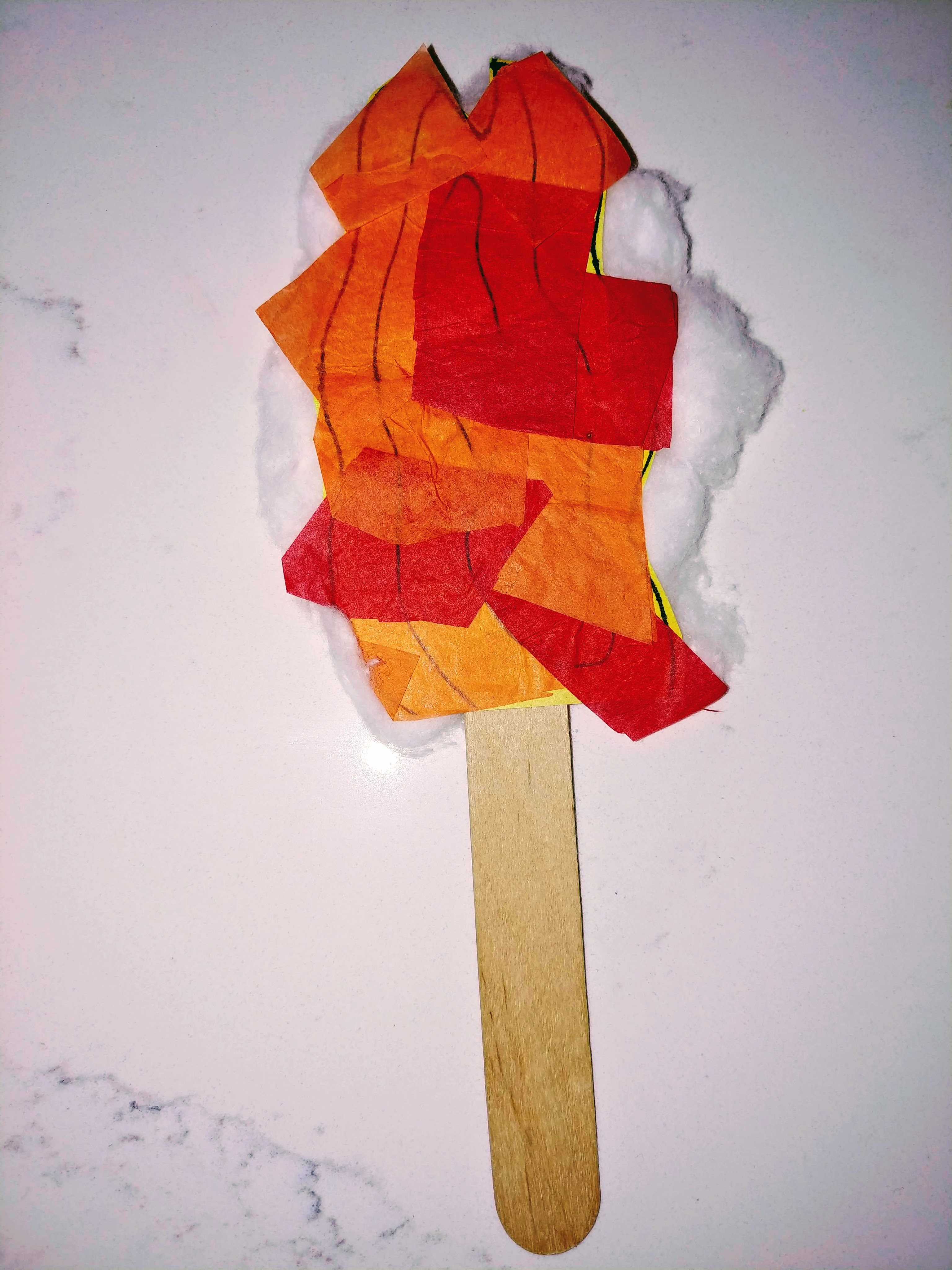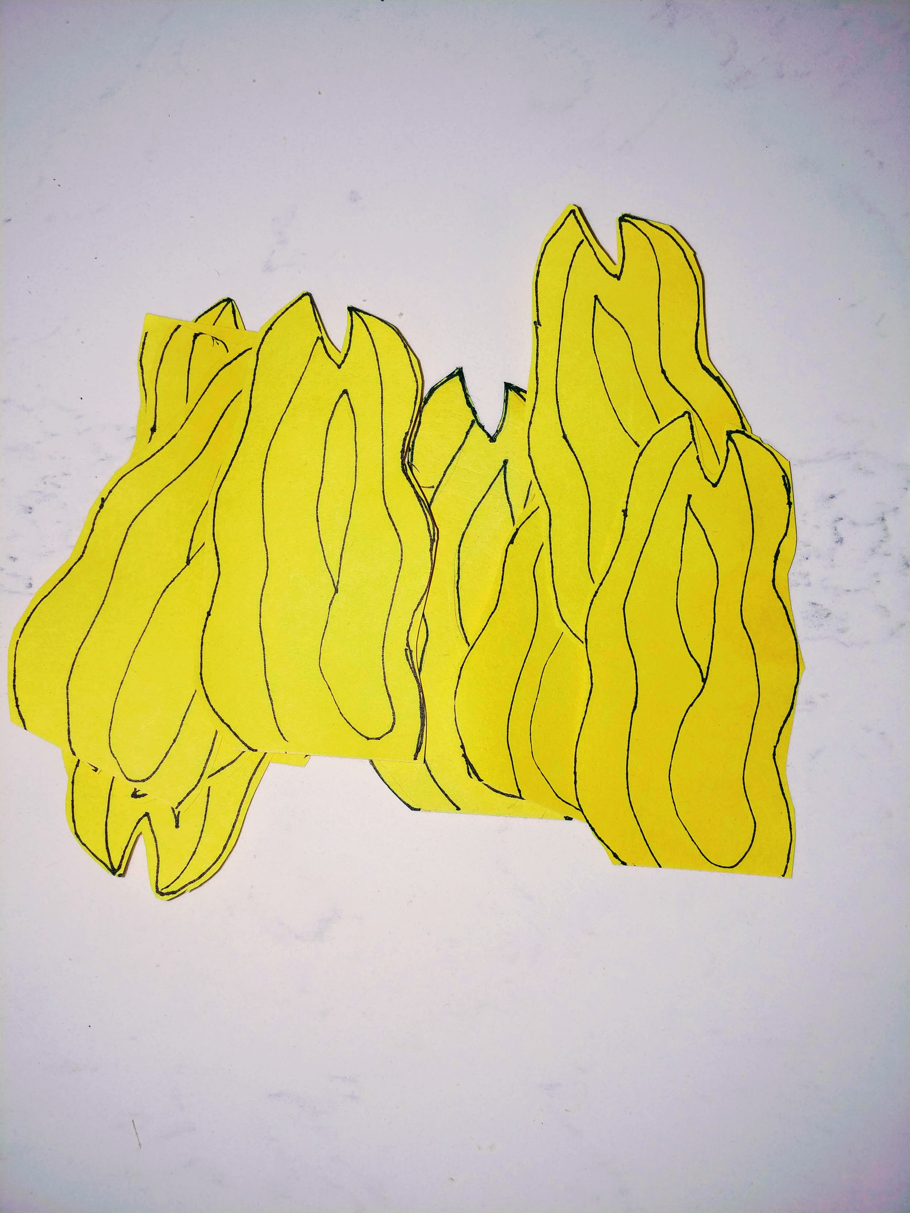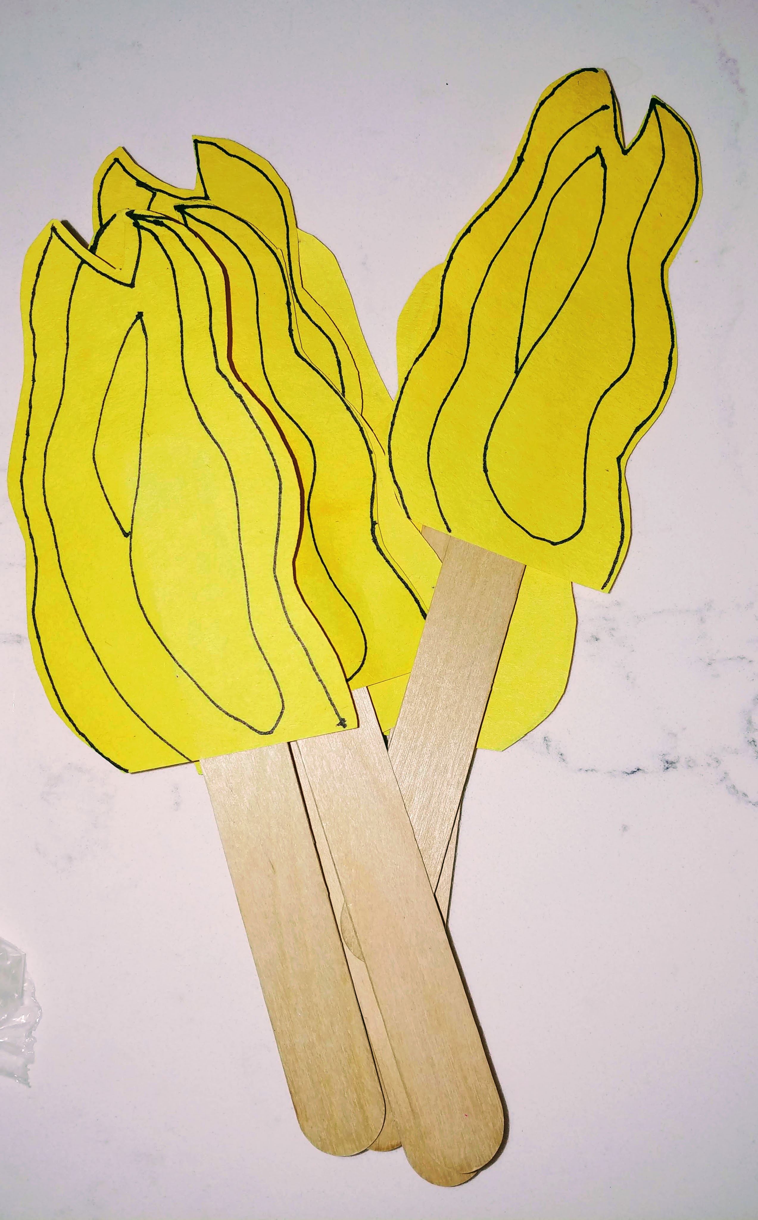 - Draw a flame on yellow construction paper. You should be able to fit at least 4 flames on each piece of construction paper.